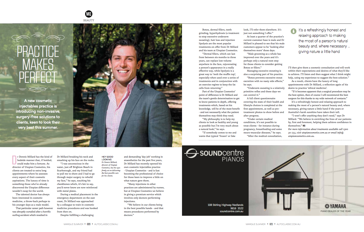 Despite fulfilling a challenging and demanding ‘day job’ working in anaesthetics for the past five years, Dr Millard has recently opened his own cosmetic injectables practice – Utopian Cosmetics – and is fast becoming the professional of choice for those keen to improve a little on what nature gave them.